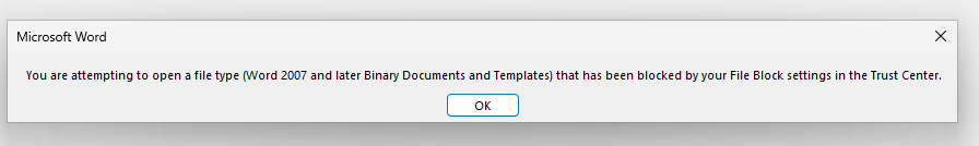 When attempting to open older Word documents users may get an error similar to the following