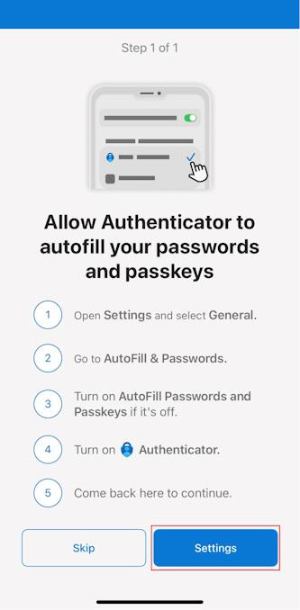 Tap Settings to enable Authenticator as a passkey provider.