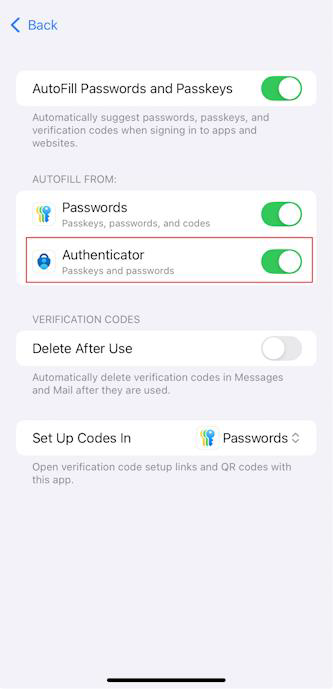 - On both operating systems, make sure that AutoFill Passwords and Passkeys is turned on. Under Autofill From, make sure that Authenticator is selected.